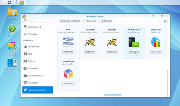 De NASsen van Synology draaien allemaal op hun eigen besturingssysteem en zelfs de alweer wat oudere versies kunnen prima als VPN-server fungeren. Daarvoor moet je allereerst via het Package Center de app vpn Server van Synology installeren. Start je browser en log in via het ip-adres van je NAS. Dubbelklik op Package Center en klik in het geopende venster op Hulpprogramma’s (kolom links) op de knop Installeren bij de app vpn Server. Wacht even tot downloaden en installatie voltooid zijn. Sluit het Package Center en start vpn Server via het startmenu.