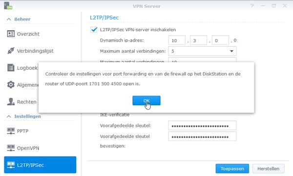 Je kunt alle standaardinstellingen betreffende het maximum aantal verbindingen in totaal en per gebruiker laten voor wat ze zijn. Kies achter verificatie voor de optie MS-CHAP v2 en verzin onder IKE-verificatie een stevig wachtwoord. Klik nu op Toepassen, waarna een melding verschijnt betreffende het doorsluizen van een aantal poorten in de firewall.