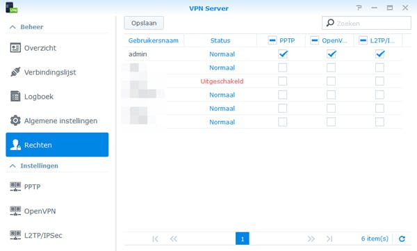 Voordat je met de Firewall-instellingen van zowel de NAS als je router aan de slag gaat, kijk je eerst nog even of de rechten goed staan bij de optie Rechten (linkerkolom). Je kunt nu per gebruiker aangeven wie wel en wie geen gebruik van VPN mogen maken, waarbij je ook per gebruiker de al dan niet toegestane protocollen kunt selecteren. Selecteer bijvoorbeeld alleen de admin-account en je weet zeker dat geen van de andere ‘gewone’ gebruikers via VPN naar binnen kunnen komen.