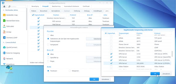 Het opzetten van de VPN-server is hiermee klaar en je kunt het venster van deze app afsluiten. Nu is het belangrijk dat je de firewall op zowel de NAS als je router zodanig configureert dat het ook VPN-verbindingen kan accepteren. Eerder hebben we je al laten zien welke poorten doorgesluisd moeten worden. Het configureren van de Synology-firewall is het eenvoudigst.