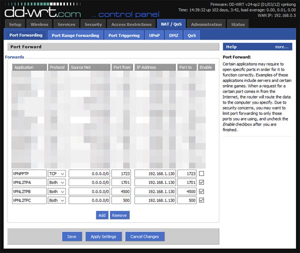 Nu moeten de eerdergenoemde poorten nog geopend worden, zoek daarvoor in je router naar de optie genaamd Port Forwarding. In dd-wrt is deze te vinden op de tab NAT/QoS en Port Forwarding.