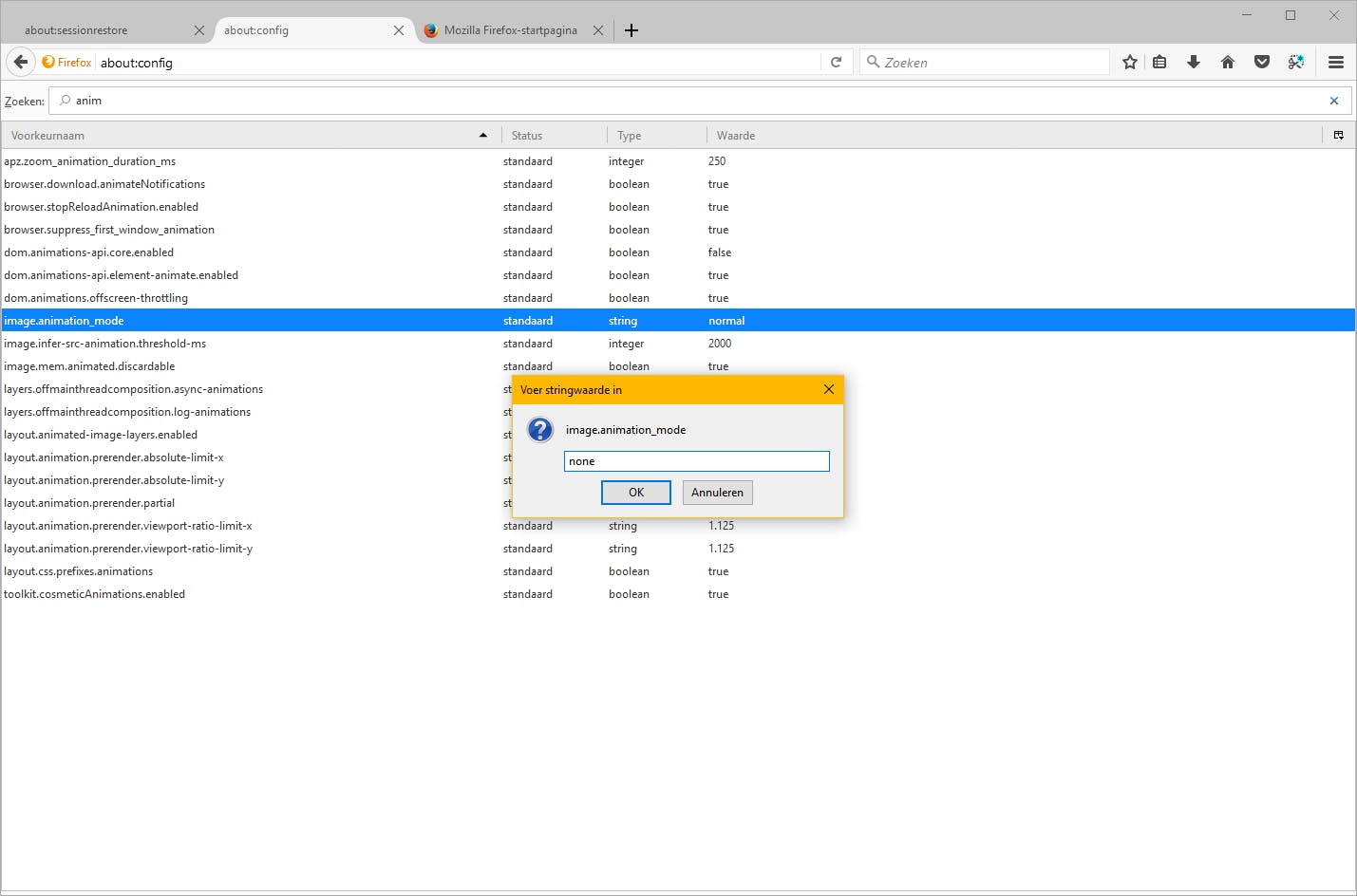De makers van Firefox hebben bij het maken van de browser er ook rekening mee gehouden dat niet iedereen zit te wachten op automatisch afspelende minifilmpjes. Je hoeft dan ook niets te installeren om daar een einde aan te maken, de optie is gewoon in de browser aanwezig. Start Firefox en typ in de adresbalk about:config en druk daarna op Enter. Je krijgt nu een of andere vage waarschuwing over garantievoorwaarden, die kun je negeren door te klikken op Ik aanvaard het risico! In het zoekveld bovenin zoek je nu op image.animation, je vindt dan een waarde genaamd image.animation_mode, dubbelklik daarop. Typ nu none in het tekstveld als je wilt dat de gif-bestanden helemaal niet meer worden afgespeeld of once als je wilt dat het na één keer ophoudt.