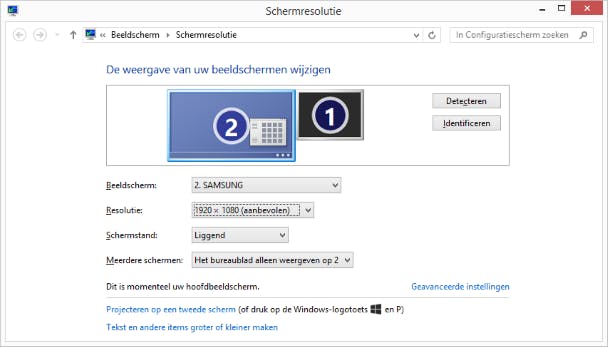 Heb je als extra scherm een televisie aan je computer gekoppeld? Als het nodig is, kun je de resolutie aanpassen. Klik hiervoor met de rechtermuisknop ergens op het bureaublad en kies voor Schermresolutie. Meestal loont het de moeite om alleen het scherm van je televisie weer te geven, omdat je dan een optimale resolutie kunt kiezen. De monitor van je computer of laptop gaat dan even op zwart. Klik achter Beeldscherm op het kleine pijltje en selecteer de naam van je televisie. Klik daarna achter Resolutie op het pijltje. Als je bijvoorbeeld een Full HD-tv hebt aangesloten, kies je een resolutie van 1920 bij 1080 pixels. Sla de instellingen op met Toepassen en Wijzigingen behouden. Open vervolgens een streamingdienst en geniet vaan haarscherpe beelden!