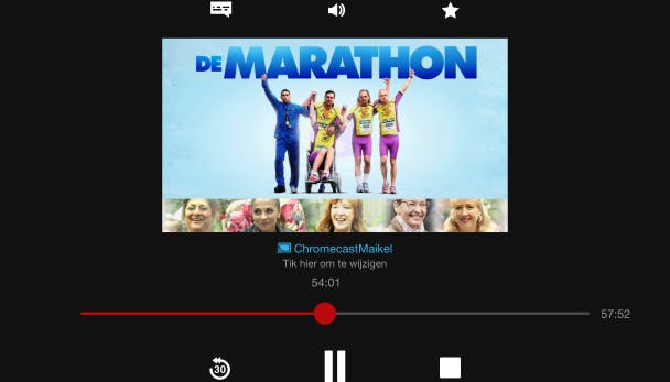 De Google Chromecast is nu aangesloten op je televisie en met het internet verbonden. Vanaf een tablet en smartphone is het nu mogelijk om films en series naar de beeldbuis te streamen. Het enige dat je daarvoor nodig hebt, is apps met ingebouwde ondersteuning voor Google Chromecast. Probeer de Netflix-app op je Android- of iOS-toestel maar eens uit. Open vanuit de catalogus een willekeurige film en druk rechtsonder op het Chromecast-pictogram (rechthoek met drie signaalstreepjes). Druk tot slot op de naam die je de Google Chromecast in tip 16 hebt gegeven. De film verschijnt direct op je televisie, waarbij je smartphone of tablet functioneert als afstandsbediening. Je kunt de film onder meer pauzeren en ondertiteling aan- of uitzetten.
