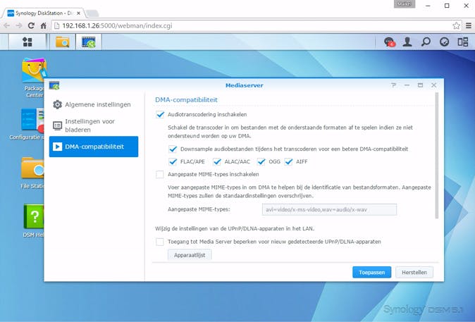 Heb je een mediabestand opgeslagen waarvoor jouw mediaspeler, smart-tv of gameconsole geen ondersteuning biedt? Geen nood, er is nog geen man overboord. Veel DLNA-servers bieden de mogelijkheid om het mediabestand tijdelijk om te zetten naar een ander formaat waarvoor wel ondersteuning is. De mediaserver van een recente Synology-NAS is bijvoorbeeld in staat om video's naar het ts-formaat te transcoderen. Afhankelijk van welk type je gebruikt, bedraagt de maximale resolutie 1080p of 480p. Ook de programma's PS3 Media Server en Plex kunnen mediabestanden naar een ander formaat omzetten wanneer de DLNA-client geen ondersteuning biedt aan het oorspronkelijke bestandstype.