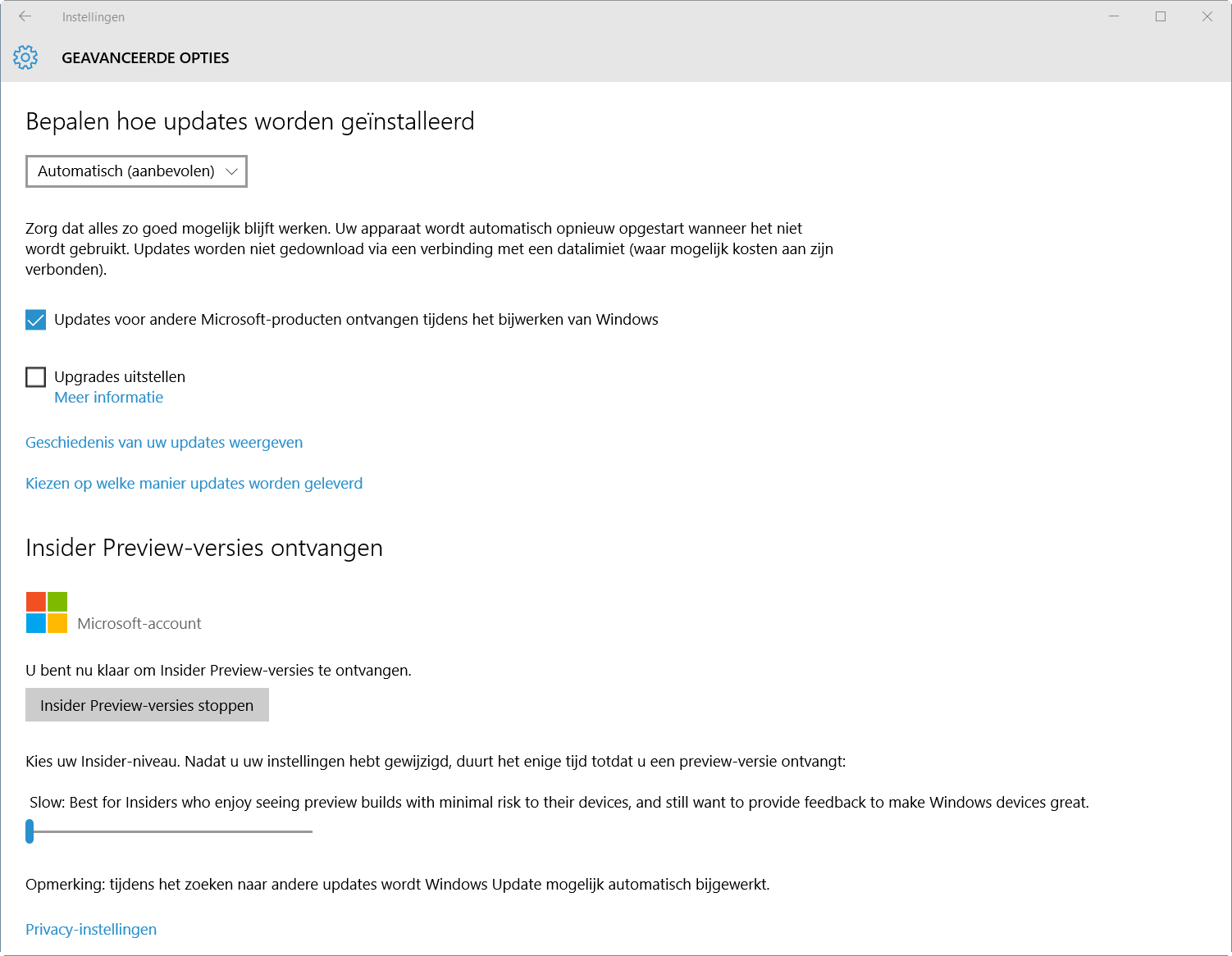 Nadat die herstart is voltooid, kun je opnieuw de Instellingen-app openen en naar Bijwerken en beveiliging, Geavanceerde opties gaan. Onderaan bevindt zich nu een schuifbalk. Hier kun je kiezen welke type builds je wilt ontvangen. Je hebt de keuze uit Release Preview en de Slow- en de Fast-niveaus. Met het niveau Fast krijg je het snelst de nieuwste functies en die is daarmee ook het instabielste. Het niveau Slow is langzamer dan Fast, maar dan krijg je wel iets stabielere Windows-versies. Reken op ongeveer 3-4 Fast-builds waarna er meestal wel 1 Slow-build uitkomt. De Release Preview is het minst interessant en geeft je alleen Windows-testupdates, updates die elke tweede dinsdag van de maand uitkomen.