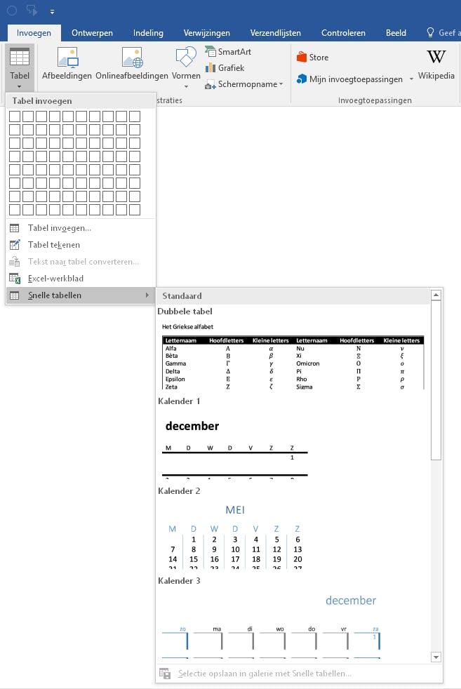De meest gebruikte manier om een tabel in Word te maken, is via het tabblad Invoegen. Daar klik je op de Tabel en kies je door met de muisaanwijzer over het raster te gaan hoeveel rijen en kolommen je nodig hebt. Standaard krijg je gewoon een witte tabel met zwarte lijntjes, maar door in de tabel te klikken, verschijnen in het Lint twee extra tabbladen: Tabelontwerp (of Ontwerpen) en Indeling. Dat uiterlijk van de tabel kun je op het tabblad Ontwerpen aanpassen in een van de vele kleuren en stijlen die bij het doel van je tabel past. Het tabblad Indeling spreekt voor zich, je kunt er onder meer rijen en kolommen aan je tabel toevoegen, samenvoegen of er juist uit verwijderen, bepalen hoe de tekstuitlijning in de cellen moet zijn enzovoort.