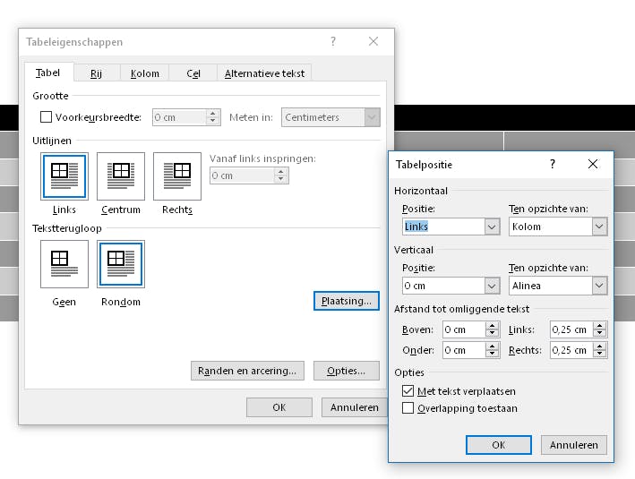 Gebruik je de tabel als verduidelijking van een stuk tekst, dan staat deze standaard tussen de verschillende tekstdelen. Maar je kunt er ook voor kiezen om de tekst rondom de tabel te laten lopen. Het voordeel van tekst rondom de tabel is dat er meer tekst op een pagina past. Klik rechts op de tabel en selecteer Tabeleigenschappen. Klik daar onder Tekstterugloop op Rondom. Het is natuurlijk niet de bedoeling dat de omliggende tekst tegen de tabel plakt. Om wat ruimte te creëren, klik je op Plaatsing. In dit venster geef je de afstand aan tot de omliggende tekst. Zorg ervoor dat de optie Verplaatsen met tekst aangevinkt is, zodat de tekst en tabel samenblijven wanneer je later de inhoud van het document wijzigt.