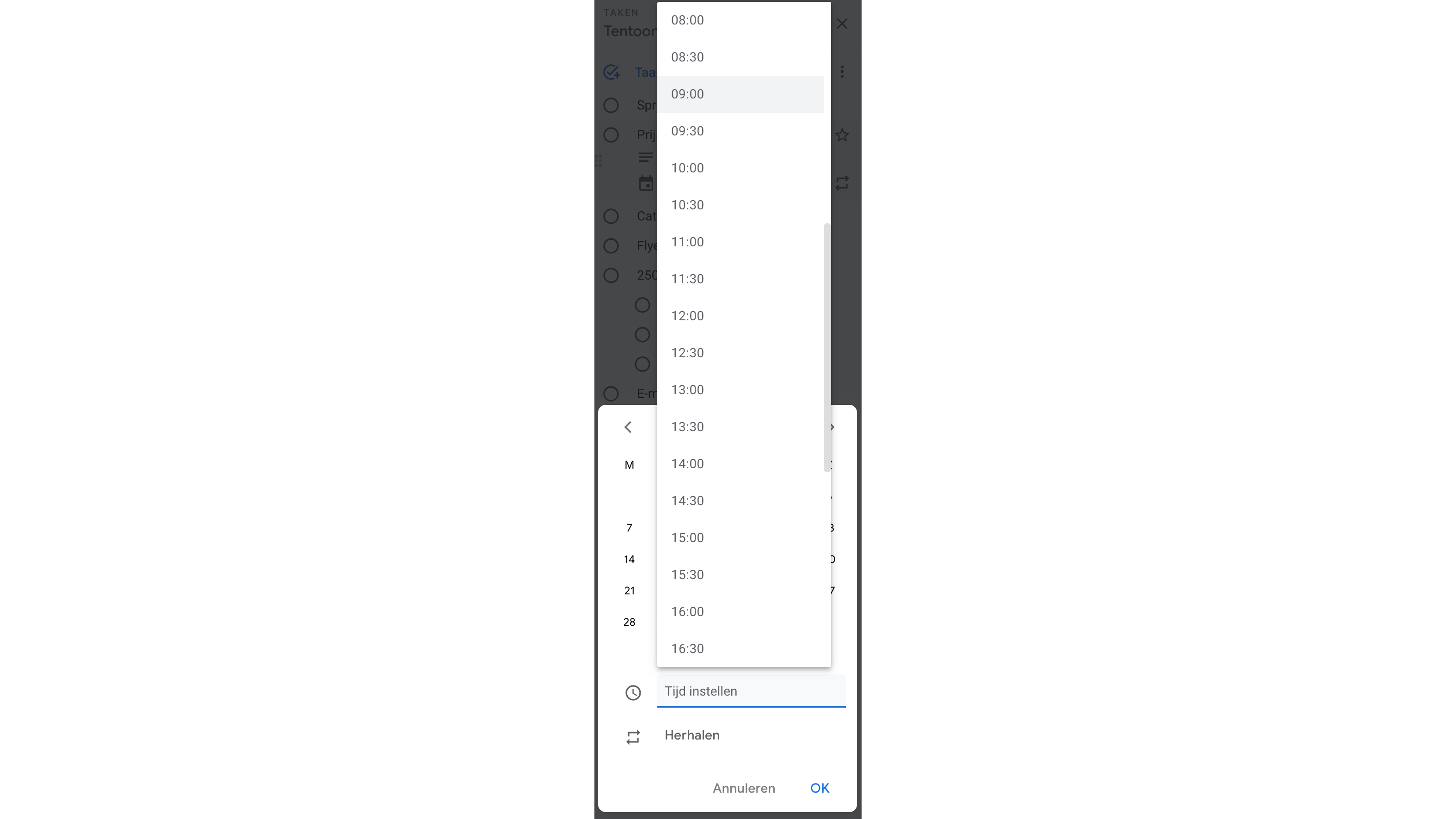 Je kunt een tijdstip voor de melding instellen per half uur, of je typt zelf een exact tijdstip.