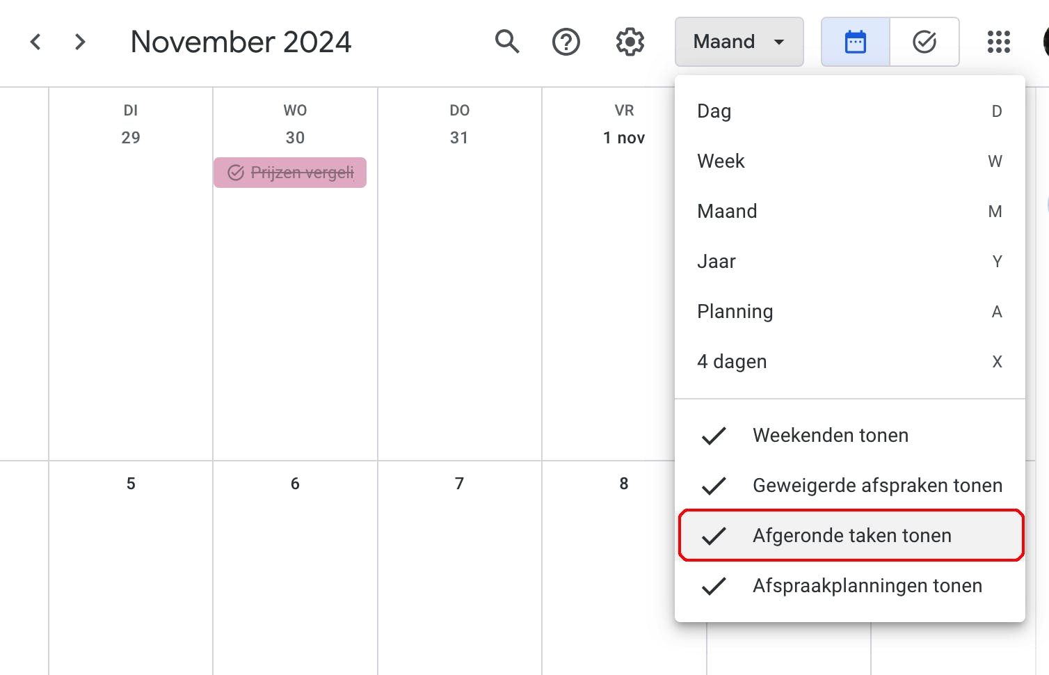 In Google Agenda kun je afgeronde taken weer zichtbaar maken.