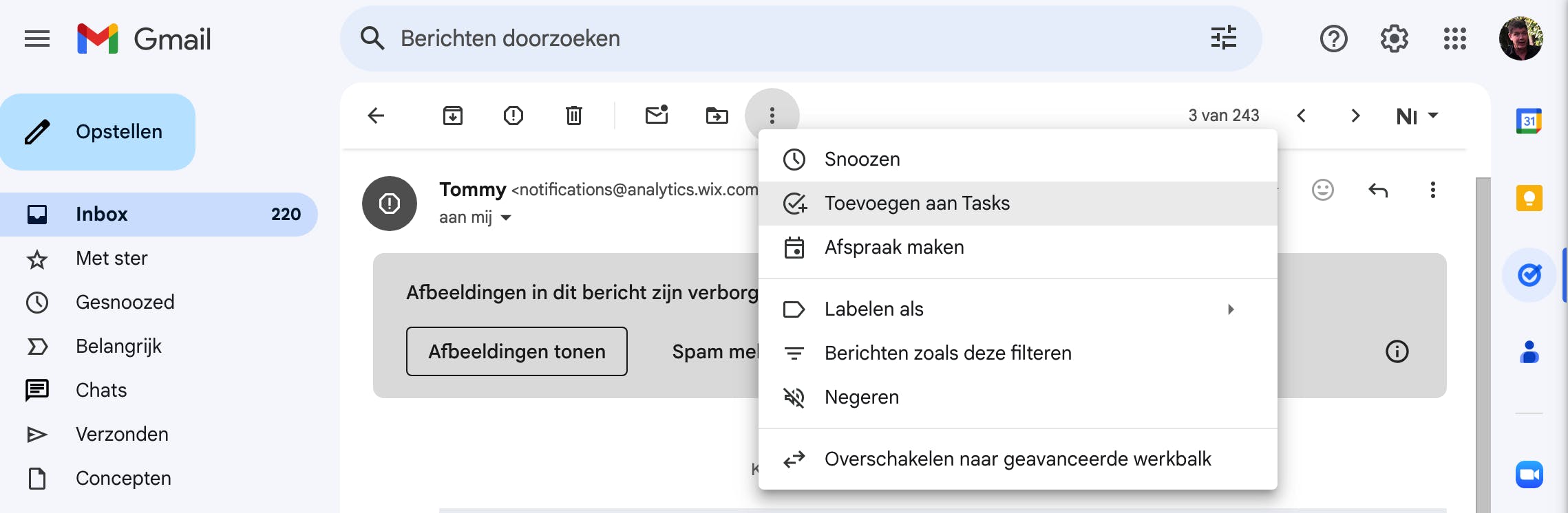 Elke e-mail in je Gmail-account kun je omzetten in een taak. Dit is handig om een e-mail op te volgen waarin een bepaalde actie van je wordt gevraagd. Open de e-mail in het startscherm van Gmail en klik bovenaan in de e-mail op de knop met de drie puntjes en kies Toevoegen aan taken. Hierdoor opent de zijbalk Taken aan de rechterkant van het Gmail-startscherm en komt de nieuwe taak automatisch in de takenlijst.