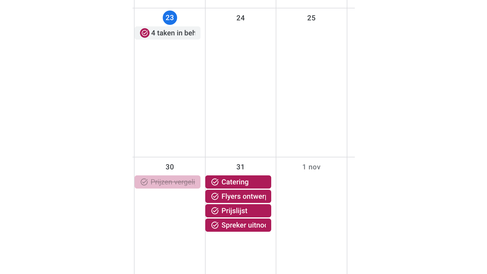 Hier selecteer je ook een takenlijst waar deze nieuwe taak bij hoort. Alle taken verschijnen op de juiste dag als gekleurde blokjes. Wanneer er meer dan één taak op een bepaalde datum staat en je ze niet allemaal kunt zien, klik je op Meer om een klein venster te openen met alle taken voor deze datum. Selecteer vervolgens een taak om deze te bekijken.
