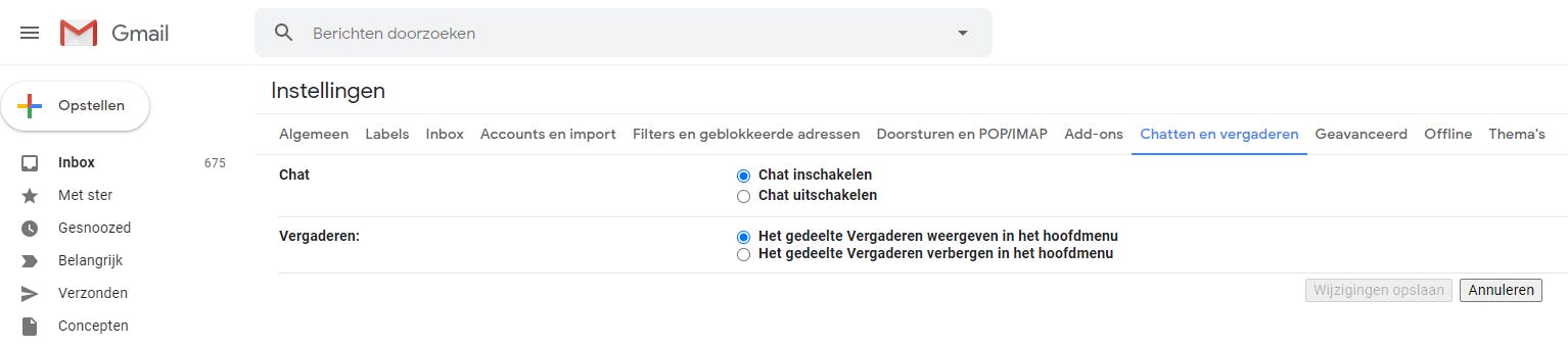 Klik dan ook rechtsboven op het tandwiel-icoontje en kies Alle instellingen bekijken. Ga dan naar het tabblad Chatten en vergaderen en kies de optie Het gedeelte Vergaderen verbergen in het hoofdmenu. Eventueel kies je ook voor Chat uitschakelen, we kennen weinig mensen die nog via Hangouts met elkaar communiceren. Klik op Wijzigingen opslaan. Je inbox wordt opnieuw geladen zonder de Meet- en Hangout-opties.