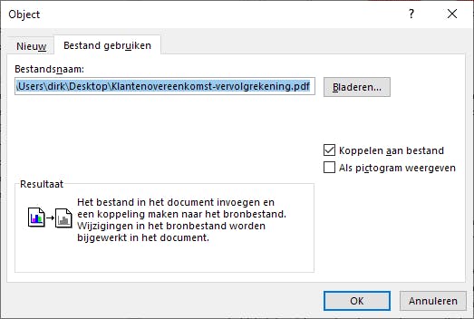 Voordat je het toe te voegen bestand daadwerkelijk aan je document toevoegt, heb je ook de optie om een koppeling te maken naar het bestand. Vink je dit aan, dan zal Word alle wijzigingen toepassen die je in het originele bestand aanbrengt.