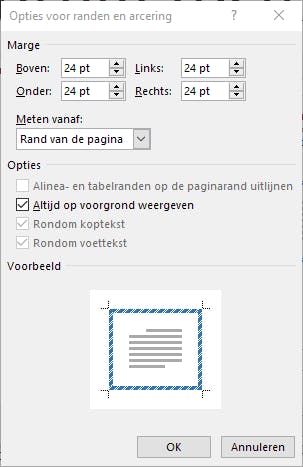 Nu moet je Word nog vertellen op welke pagina’s je de rand wilt toepassen. Moet-ie rond het Hele document, Deze sectie, Deze sectie – Alleen eerste pagina of Deze sectie – Alles behalve eerste pagina verschijnen? Onder de knop Opties zitten de instellingen om de marge tussen de papierrand en het kader te bepalen.