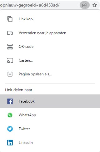 Surf met Chrome eerst naar een webpagina die je op social media wilt delen, bijvoorbeeld een nieuwsbericht of reisverslag. Je klikt vervolgens helemaal rechts in de adresbalk op het deelpictogram. Je herkent dit pictogram aan het pijltje. In het deelmenu staan verschillende opties. Bepaal onder Link delen op welke sociale-mediawebsite je de link wilt publiceren. Je hebt keuze uit Facebook, WhatsApp, Twitter en LinkedIn.