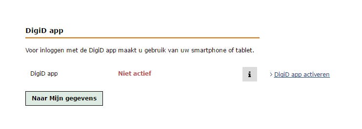 Je komt op een pagina terecht met je persoonlijke gegevens. Scroll een stukje omlaag om Inlogmethoden te vinden. Achter DigiD app staat nu nog Niet actief. Klik ernaast op DigiD app instellingen, en daarna op DigiD activeren.