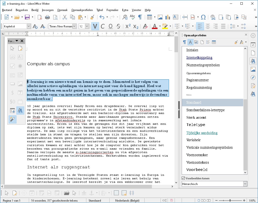 Met Writer kun je alles schrijven: van kleine memo’s tot volledige boeken. De standaardwerkbalk bevat alles om je tekstdocumenten op te maken. Er staan zelfs knoppen bij om het document per e-mail te verzenden of om het document op te slaan in pdf-formaat. Op de werkbalk vind je ook de functies om de tekst in secties te splitsen, om tabellen te maken en om illustraties toe te voegen. Writer heeft zelfs een speciale werkbalk om formulieren te ontwerpen die je in het docx- of in het pdf-formaat bewaart. Bij het opmaken van de formulieren kun je besturingselementen toevoegen zoals keuzelijsten, keuzevakjes, labels en velden.
