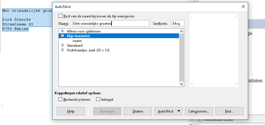 Maak het jezelf gemakkelijk en laat stukjes tekst die je vaak gebruikt invoeren door AutoTekst. Wil je bijvoorbeeld de slotformule “Met vriendelijke groeten” gevolgd door je naam en eventueel adres vastleggen in AutoTekst, dan typ je eerst deze tekst, je selecteert hem en je drukt op Ctrl+F3. In het AutoTekst-venster geef je dit fragment een naam en je kiest een sneltoets. In het vak daaronder klik je op de categorie Mijn Autotekst. Daarna klik je op de AutoTekst-knop waar je de optie Nieuw kiest. Sluit dit venster. Wanneer je later tijdens het schrijven de sneltoets gebruikt en daarna de F3-toets indrukt, zal Writer de geselecteerde tekst automatisch invoegen.