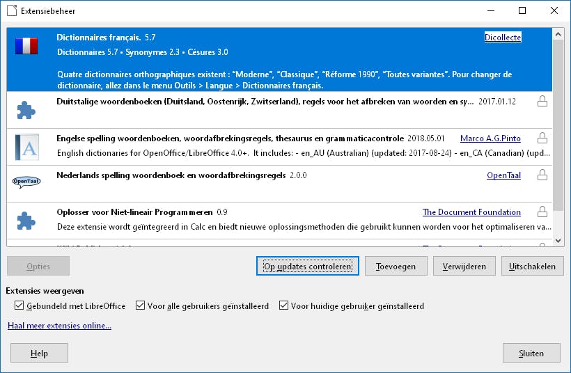 Standaard heeft LibreOffice de Nederlandse woordenlijst en woordafbrekingen geïnstalleerd. Wil je deze tekstverwerker ook inzetten om in andere talen te schrijven, dan wil je de woordenlijsten van die vreemde taal natuurlijk ook installeren. Je haalt die extra talen binnen via het menu Extra / Extensiebeheer. In dit venster beheer je de extensies die je ooit hebt geïnstalleerd en via de knop Haal meer extensies online maak je verbinding met de online extensiebank van LibreOffice. Behalve allerhande woordenboeken vind je hier hulpmiddelen voor de modules Draw, Base en Math en allerlei modeldocumenten die andere gebruikers hebben gedeeld. Er zit interessant materiaal bij, zoals een tool om voertuigonkosten te berekenen, een extensie om tekstvakken te voorzien van dummy-tekst, een sjabloon om de suikerwaarden in het bloed bij te houden en veel meer. Nadat je de extensie hebt geïnstalleerd, moet je LibreOffice wel even herstarten.