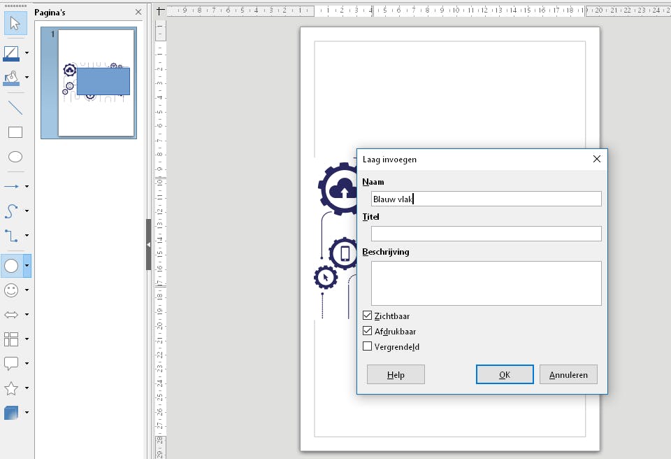 Je maakt en bewerkt de tekening op de grote werkruimte in het midden. Op dit werkvlak plaats je vormen, tekstvakken en afbeeldingen. Een tekening kun je ook over verschillende pagina’s verdelen. In dat geval is het paneel Pagina’s erg handig om in beeld te zeten. Bovendien kan Draw elementen op verschillende lagen manipuleren. Met behulp van lagen organiseer je complexe onderwerpen in logische groepen. Onderaan het werkvlak zie je uit hoeveel lagen de tekening bestaat en van iedere laag kun je de transparantie instellen.