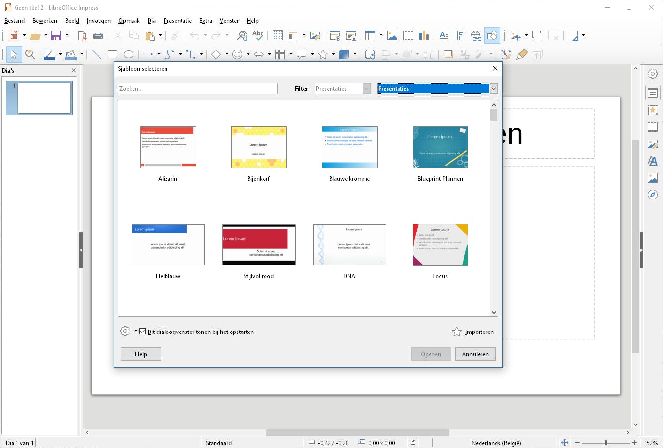De PowerPoint van LibreOffice heet Impress. In versie 6 is de standaardgrootte van een dia 16:9, wat overeenkomt met de verhouding van recente schermen en projectors. De dia’s die je maakt, zullen veelal verschillende elementen bevatten: tekst, lijsten met opsommingstekens, tabellen, grafieken, foto’s en tekeningen. Het hoofdvenster bestaat uit het deelvenster Dia’s, de werkruimte en de zijbalk. De gemeenschappelijke functies van alle LibreOffice-applicaties hebben een samenhangende gebruikersinterface, zodat je ook hier snel de knoppen herkent om de dia’s op te maken. Het paneel Dia’s bevat alle onderdelen van de presentatie in de juiste volgorde. Om die volgorde aan te passen of om snel een aantal dia’s te verwijderen, open je de Diasorteerder via het menu Beeld. Wanneer je denkt dat een dia tijdelijk overbodig is maar hem niet direct wilt verwijderen, dan kun je hem verbergen via het rechtermuisknopmenu.