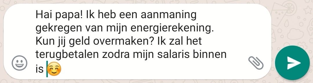 Nu is dit nog een redelijk verregaande manier van fraude. Er zijn ook mensen die zich per WhatsApp voordoen als familieleden of vrienden die geld nodig hebben. Dit wordt vaak gevraagd in heel realistische gesprekken, dus niet een vaag verhaal in gebrekkig Nederlands van iemand die je helemaal niet kent, maar een heel normaal gesprek dat heen en weer gaat met iemand die je denkt te kennen. “Kun je me ff helpen?” “Pap, kun je het geld nu overmaken?” Een zielig of juist heel voor de hand liggend verhaal erbij en voor je het weet maak je geld over naar iemand waaraan je nog geen cent zou willen spenderen.