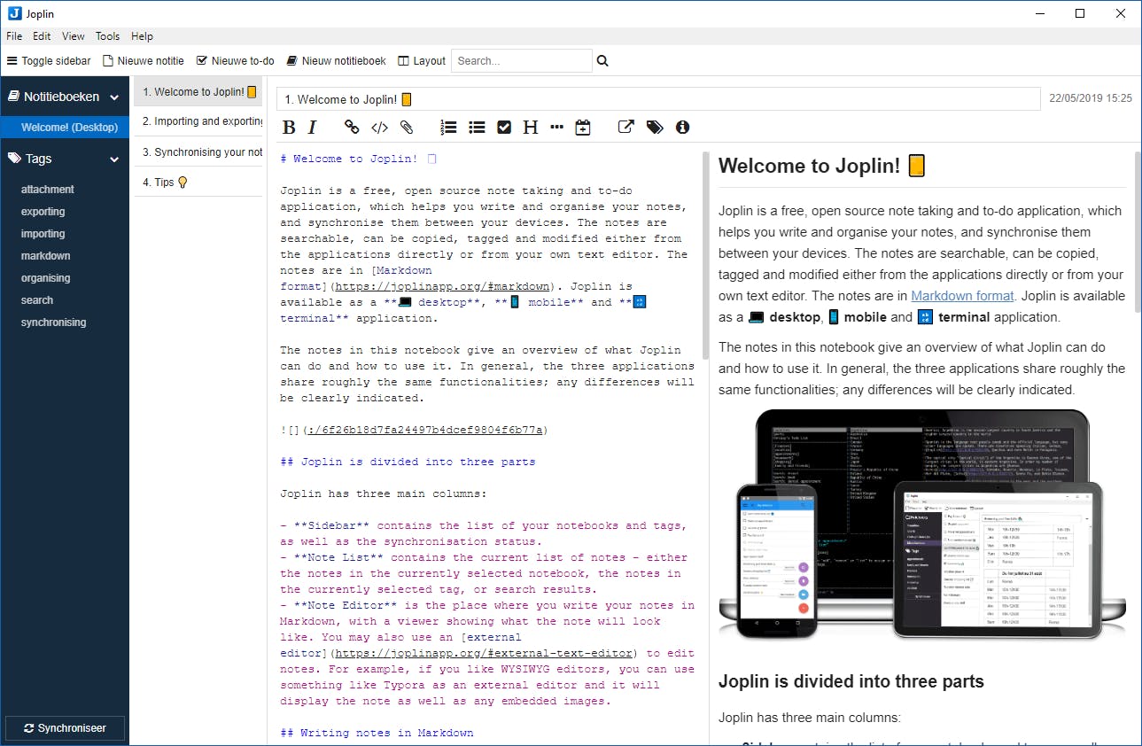 Je kent vast wel de programma’s als OneNote en Evernote voor het bijhouden en organiseren van notities. Met het gratis en opensource Joplin kun je vrijwel hetzelfde, zoals je in deze workshop zult lezen. Zowel op de desktop (Windows, macOS en Linux) als op mobiele apparaten (Android en iOS) kun je hiermee je notities bewerken of takenlijsten bijhouden. Gebruik het bijvoorbeeld voor notities voor studie of werk, het documenteren van programmeerprojecten, bijhouden van boodschappenlijstjes of lijsten met klusjes in de tuin. Uiteraard voorziet Joplin ook in synchronisatie, met als meerwaarde dat je zelf kunt kiezen waar notities worden opgeslagen.