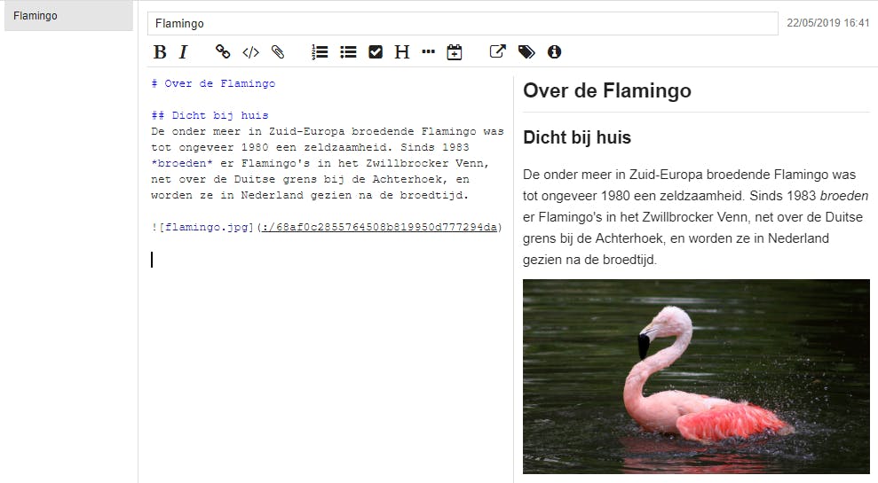 In het navigatievenster links zie je een overzicht van je notitieboeken en de notities daarin. Het hoofdvenster is gesplitst in tweeën: in het linkerdeel kun je notities invoeren in het zogenaamde Markdown-formaat, rechts zie je het resultaat in leesweergave. Via View / Toggle editor layout (Ctrl+L) kun je deze indeling wijzigen. Boven de editor zie je een reeks knoppen die je helpen met bijvoorbeeld tekstopmaak of het toevoegen van bestanden en tags. In het navigatievenster kun je gemakkelijk bladeren door alle tags die je aan notities hebt toegekend. Via het zoekvak kun je ook op trefwoord in je notities zoeken.
