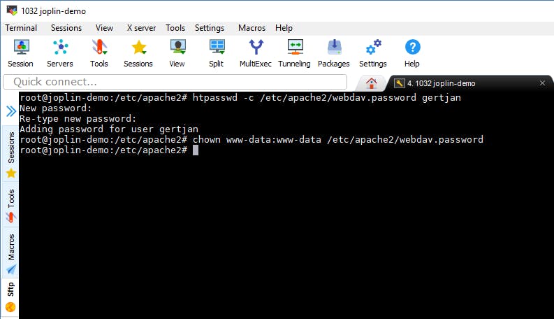 Maak de configuratie actief met a2ensite webdav gevolgd door systemctl reload apache2. Let op of er bij die laatste stap fouten worden ontdekt. Is dat het geval, kijk dan de configuratie goed na. We kiezen in deze configuratie voor de zogenaamde Basic Authentication, om compatibel met Joplin te blijven.