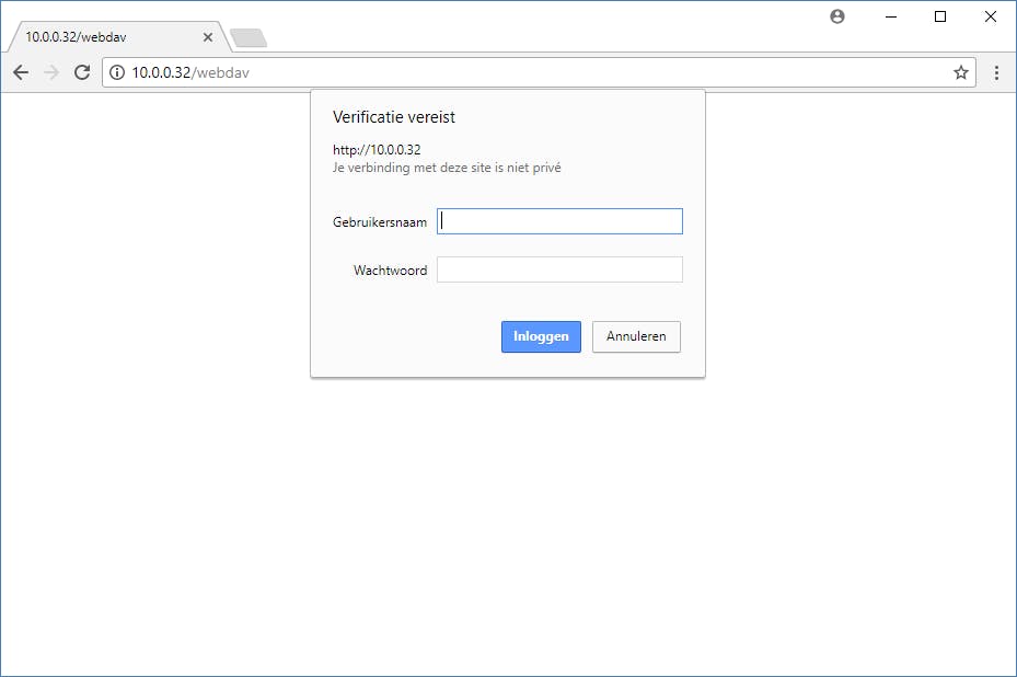 Nu de configuratie actief is, kunnen we via een browser eenvoudig testen of toegang werkt. Maak een bestandje aan in de map voor WebDAV met
