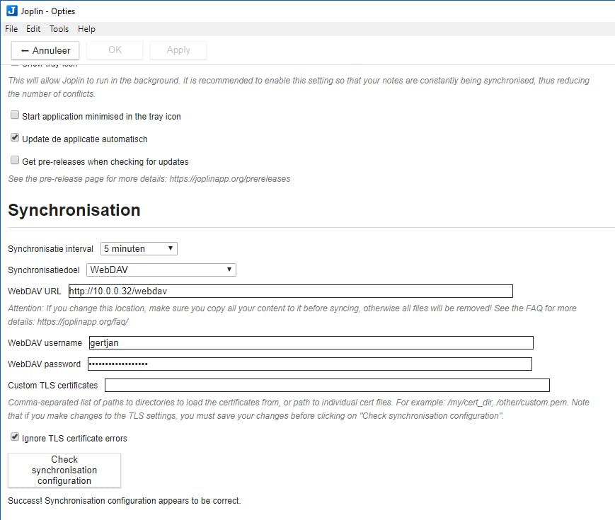 We zijn nu klaar om de server in Joplin te gebruiken, zodat notities voortaan hiermee worden gesynchroniseerd. Ga hiervoor naar Tools / Algemene opties en blader naar onderen. Bij Synchronisatiedoel kies je WebDAV. Achter WebDAV URL voer je de link in, in de vorm http://ipadres/webdav/. Voer ook je gebruikersnaam en wachtwoord in. Zet een vinkje bij Ignore TLS certificate errors. Dat is vooral van toepassing als je voor https (met self-signed certificaat) kiest. Klik dan op Check synchronisation configuration. Als alles goed is ingesteld, krijg je en melding dat synchronisatie succesvol is.