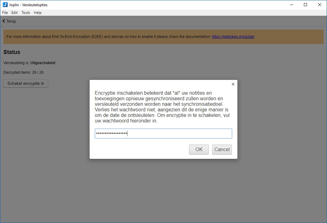 Het is verstandig om je notities met end-to-end-encryptie te beschermen, zodat de inhoud tijdens het synchroniseren, op de pc én op de server niet leesbaar is. Hiervoor wordt een zelf te kiezen hoofdwachtwoord gebruikt. Om versleuteling aan te zetten ga je naar Tools / Versleutelopties en kies Schakel encryptie in. Voer het gewenste hoofdwachtwoord in en zorg dat je dat niet kwijtraakt, want dan verlies je ook toegang tot de notities. Je notities zullen hierna worden versleuteld en bijgewerkt op de server. Doe dit bij voorkeur op je pc, want bij een groot aantal notities vraagt dit wat computerkracht. Op elk apparaat zal (eenmalig) om het hoofdwachtwoord worden gevraagd, naast natuurlijk de inloggegevens voor WebDAV zelf.