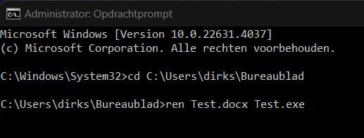 Je kunt ook de Opdrachtprompt gebruiken. Typ cmd in het zoekvak. Klik de rechtermuisknop op Opdrachtprompt en kies Als administrator uitvoeren. Daarna moet je de opdracht cd gebruiken om de locatie aan te duiden van de map waarin het bestand staat. Bijvoorbeeld cd C:\Users\gebruikersnaam\Bureaublad voor een bestand op het bureaublad. Daarna geef je de code om het bestand te hernoemen. De code is ren gevolgd door de oude naam en de nieuwe naam. In dit geval wordt het bijvoorbeeld ren Test.docx Test.exe. En druk op Enter om te bevestigen.