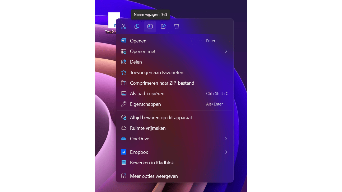 Vanuit het contextueel menu kun je de naam en de extensie wijzigen.