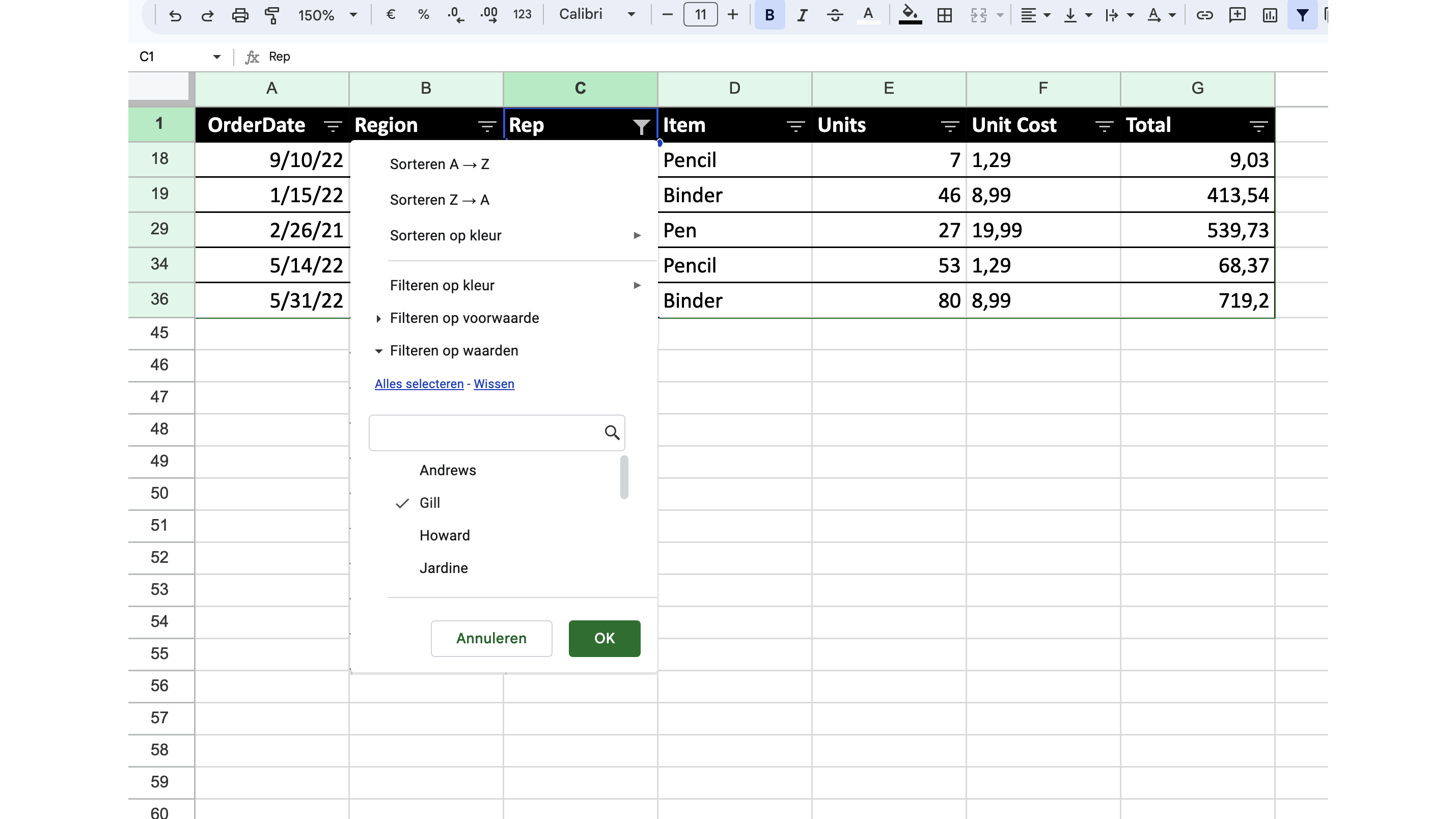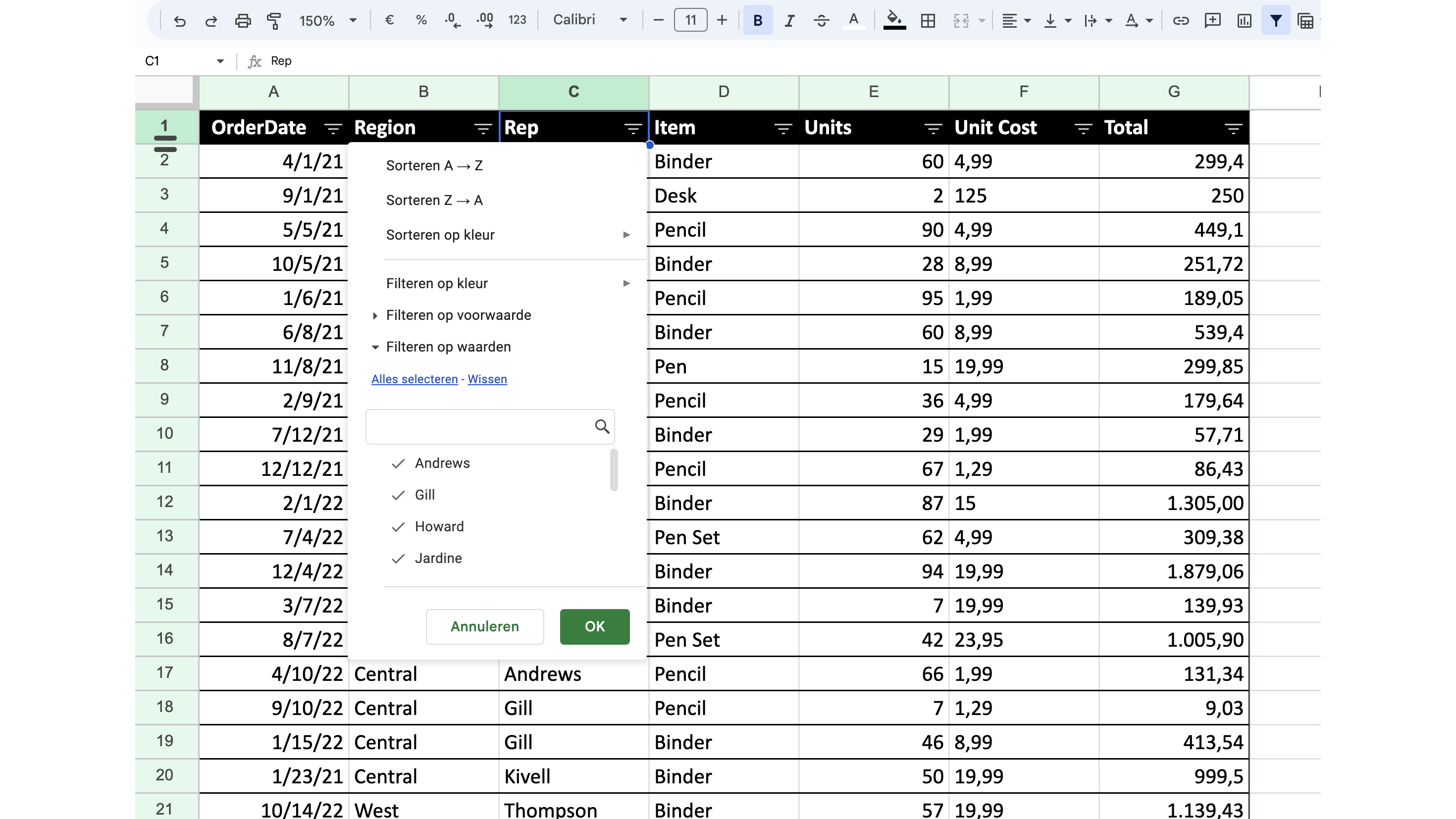 Onderaan in deze pop-up zie je dat alle namen van de verkopers al zijn aangevinkt. Wil je alleen de resultaten zien van één of enkele verkopers, dan plaats je een vinkje bij de namen die je interesseren. De rest vink je uit. Dat noemen we: filteren op waarden. Om dit aanvinken sneller te laten verlopen, kun je de knoppen Alles selecteren en Wissen gebruiken. Met ‘Wissen’ bedoelt Google Spreadsheets ‘Alles wissen’. Aan de kolomkoppen herken je in welke kolom er is gefilterd. Daar staat een filterpictogram in plaats van het omgekeerde driehoekje. Om alle gegevens terug te zien, gebruik je de knop Alles selecteren.