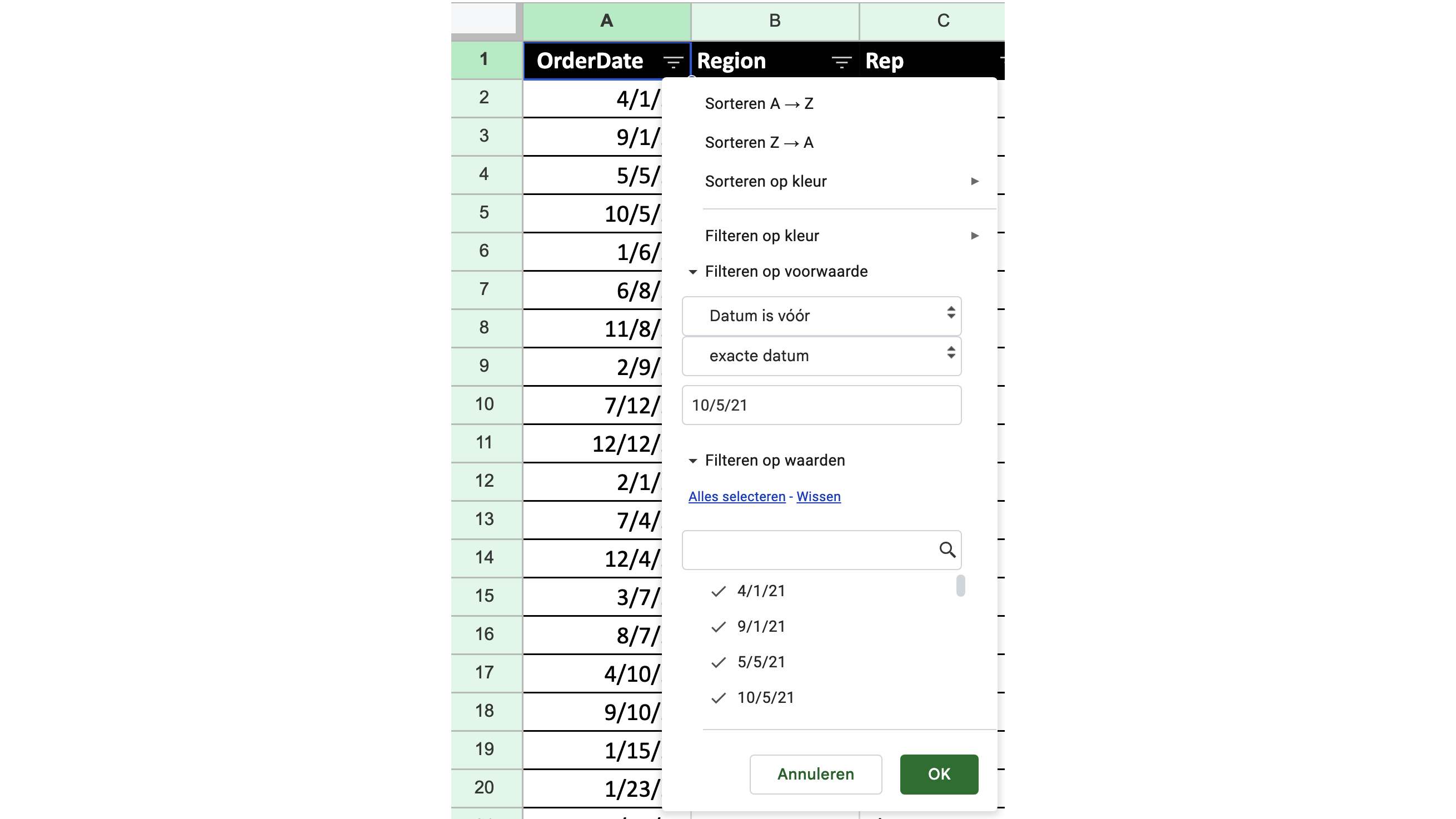 In plaats van te filteren op waarden kun je in hetzelfde pop-upvenster ook filteren op voorwaarde. Op die manier kun je een criterium uit de lijst gebruiken, zoals Datum is na, of Groter of gelijk aan … Zo kun je de gegevens van een bepaalde periode bekijken of de data van een bepaald aantal verkochte units.