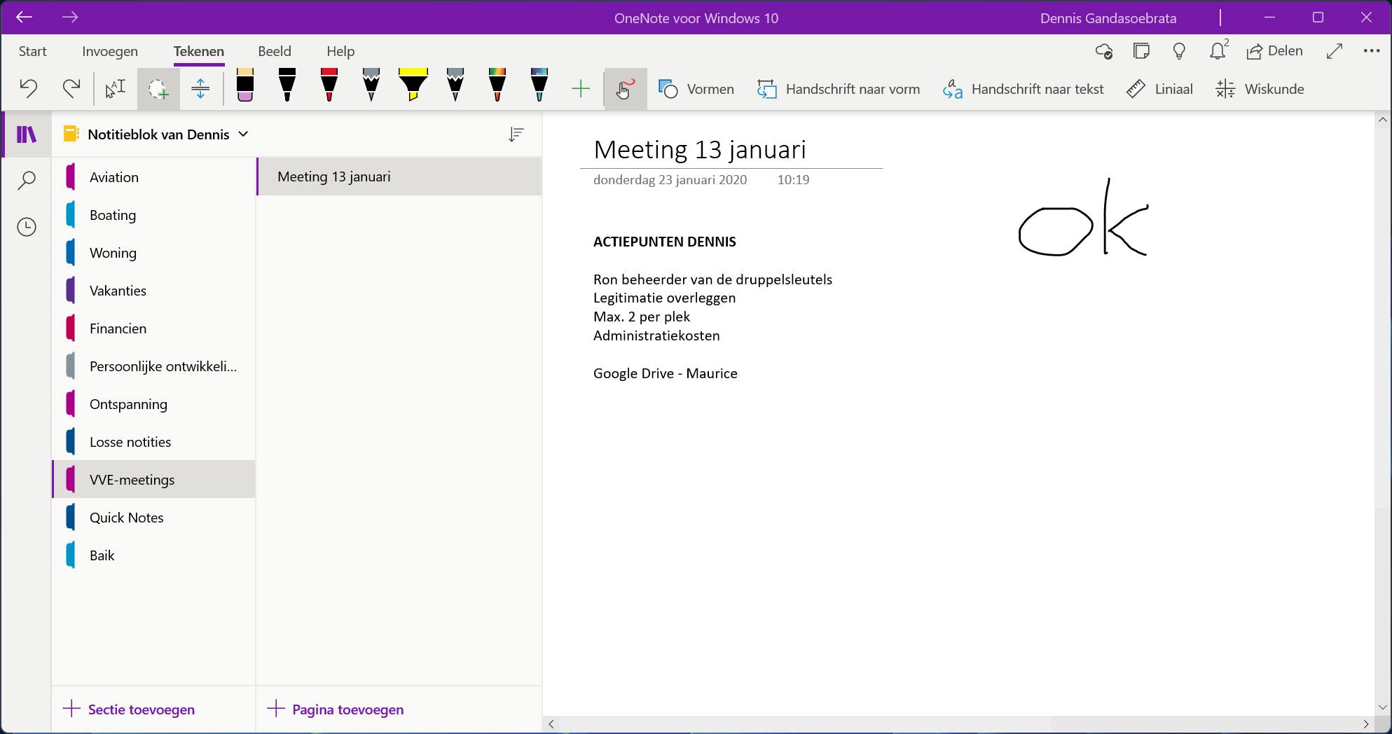 Interessant is de mogelijkheid om in OneNote handgeschreven notities te maken. Bijvoorbeeld als je een telefoongesprek voert en snel de belangrijkste informatie, zoals een afspraak of telefoonnummer wilt noteren. De handgeschreven notitie kun je vervolgens omzetten naar een getypte notitie.