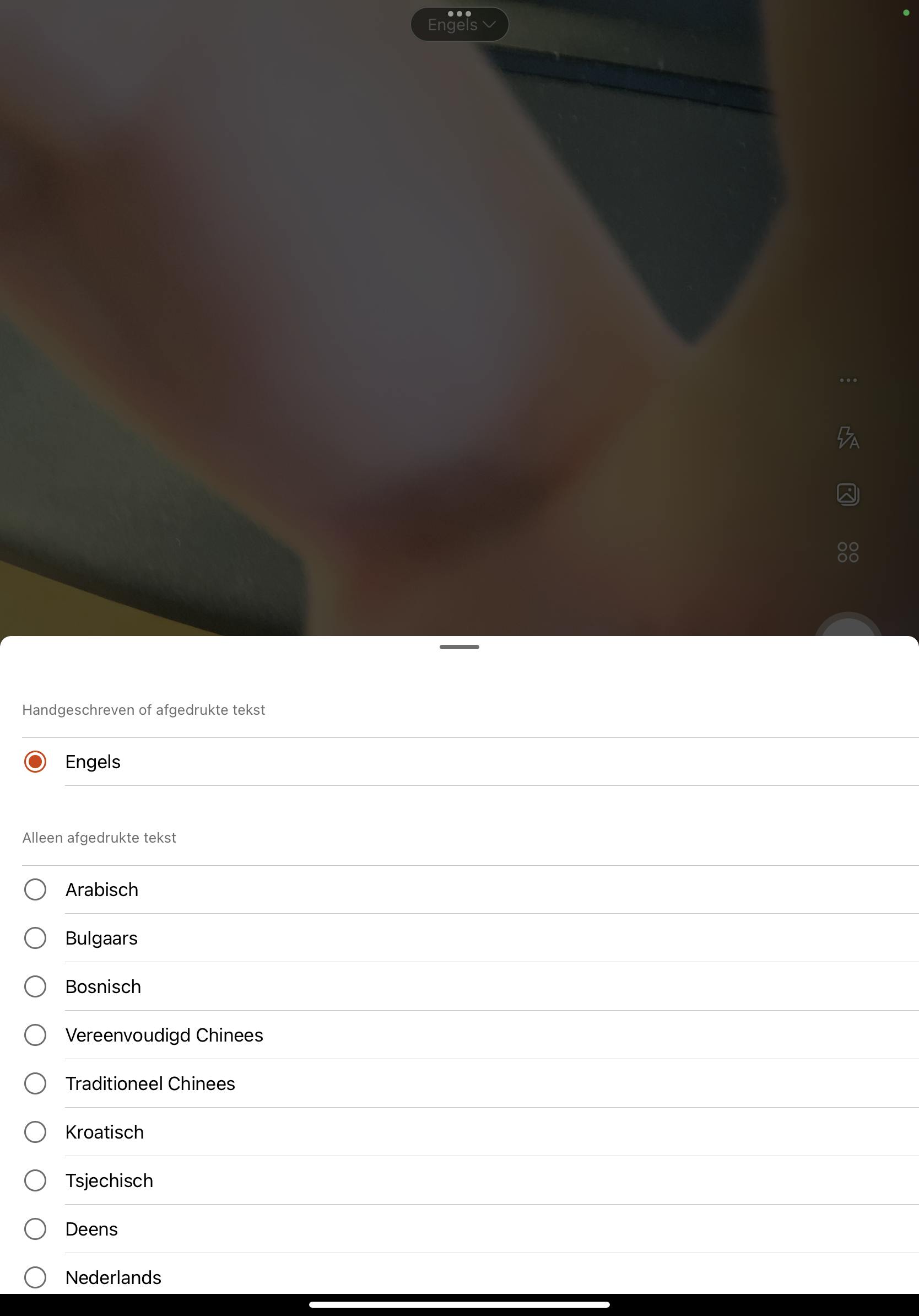 Wil je Nederlandse teksten omzetten naar tekst, tik dan op Engels. Een overzicht van beschikbare talen, waaronder Nederlands, verschijnt. Maak hierna een foto van het document via de bijbehorende knop. Een voorbeeld wordt getoond.