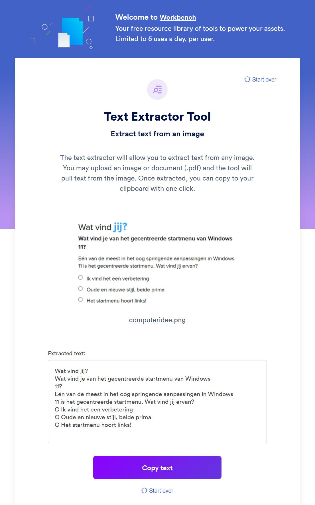 Houd bij het gebruik van dergelijke onlineprogramma’s wel het privacyaspect in het achterhoofd: de analyse vindt immers plaats op externe servers en niet op de lokale computer. Gaat het om informatie die je liever niet deelt, dan raden we het gebruik van deze onlinediensten af. Text Extractor Tool kent een limiet: je mag deze gratis vijf keer per dag gebruiken.
