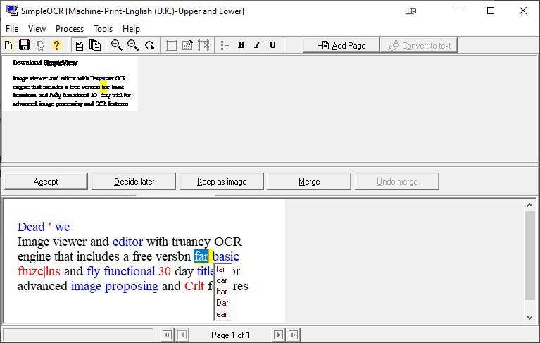 SimpleOCR ondersteunt tif-, jpg- en bmp-afbeeldingen. Open het bestand en bevestig met Continue. Kies voor Convert to text. In het vak onderin zie je de uitkomst. Woorden waarover de software niet zeker is, worden gemarkeerd. In een menu vind je de suggesties. Klik op Accept als het omgezette woord correct is of corrigeer het. Via de knop Decide later kun je de beslissing uitstellen en er later op terugkomen.