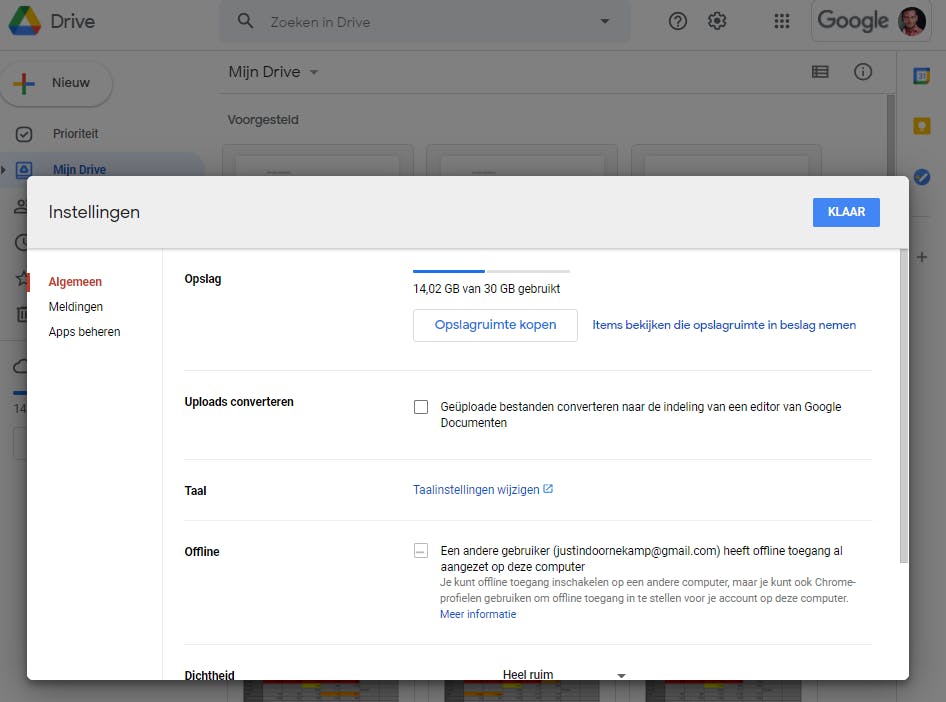 Open Google Drive opnieuw in je browser en klik op het tandwielicoontje om naar Instellingen te gaan. Zet een vinkje bij Geüploade bestanden converteren naar de indeling van een editor van Google Documenten. Bevestig je keuze met KLAAR.