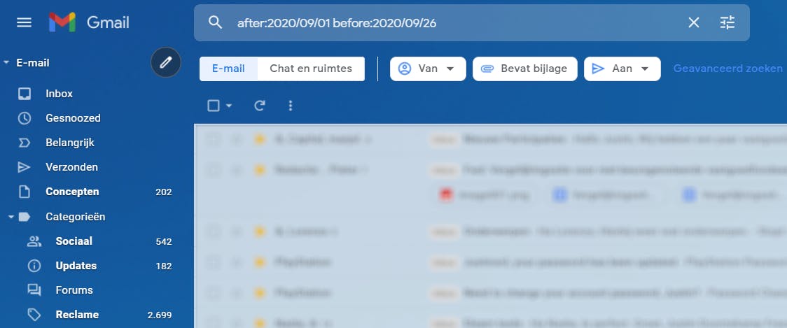 Door to:me uit de commando te halen, neem je in de zoekresultaten niet alleen de ontvangen mails mee, maar ook de verstuurde berichten. Door een after- en before-commando te combineren kun je zoeken op een specifieke periode. Zo zoek je met after:2020/09/01 before:2020/09/26 (al dan niet inclusief to:me) naar mails die je tussen 1 en 26 september 2020 hebt ontvangen en verstuurd.