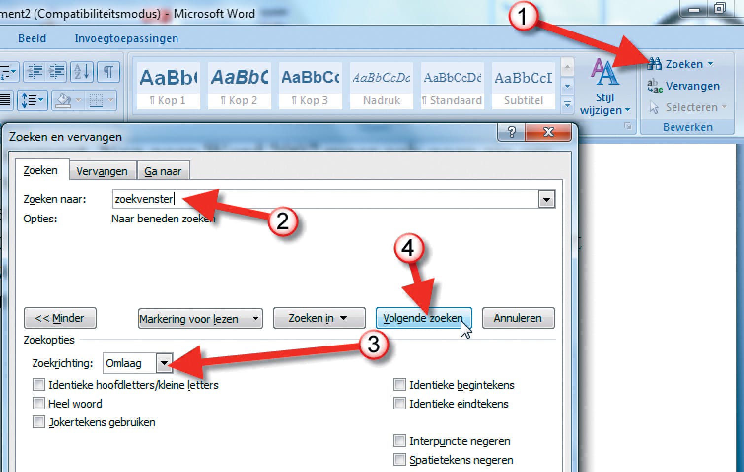 Start Microsoft Word, in dit voorbeeld werken we met Word 2007. Word gestart? Klik dan in het lint op de tab Start en daarna helemaal aan de rechterkant op Zoeken. Met het zoekvenster kunt u snel woorden zoeken, handig is hierbij de mogelijk om voor of na de plaats van de cursor in de tekst te zoeken. Stel dat u al een deel van een tekst hebt gecorrigeerd en alleen ná de cursor wilt zoeken, dan klikt u op het genoemde Zoeken (1). Tik de gewenste zoekterm in het veld bij (2) en klik dan op de knop Meer. Selecteer in het menu achter Zoekrichting de optie Omlaag (3) en klik op Volgende zoeken (4). Herhaal deze stappen zo vaak als nodig.