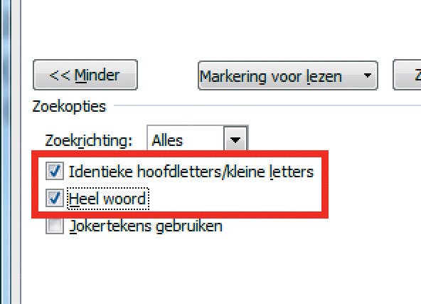 Wilt u zoeken naar woorden die met een hoofdletter beginnen (kan handig zijn als u bijvoorbeeld alleen exemplaren aan het begin van een zin of namen zoekt), dan schakelt u in het zoekvenster de optie Identieke hoofdletters/kleine letters in. Door de optie Heel woord in te schakelen vindt u bovendien alleen complete woorden die aan uw zoekopdracht voldoen. Normaliter zou u namelijk bij zoeken naar water ook het woord waterwerk vinden. Met Heel woord ingeschakeld wordt echt alleen water gevonden.