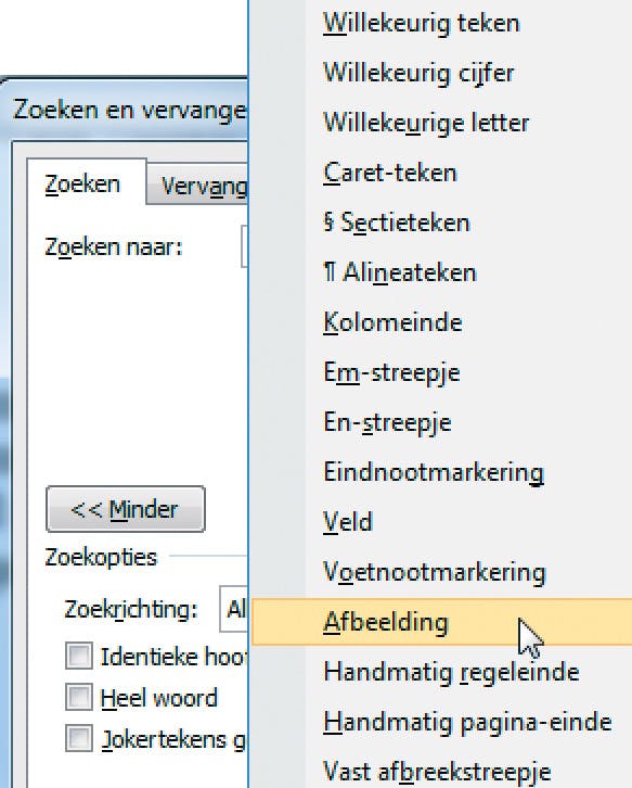 Praktisch is ook de optie om snel naar afbeeldingen in een Worddocument te zoeken. Klik daarvoor op de knop Speciaal en selecteer in het daarop geopende menu de optie Afbeelding. Voordat u dat doet, dient u er echter wel voor te zorgen dat er geen zoekwoord in het veld achter Zoeken naar staat, anders gaat het fout. Door nu herhaaldelijk op Volgende zoeken te klikken spring u van afbeelding naar afbeelding.