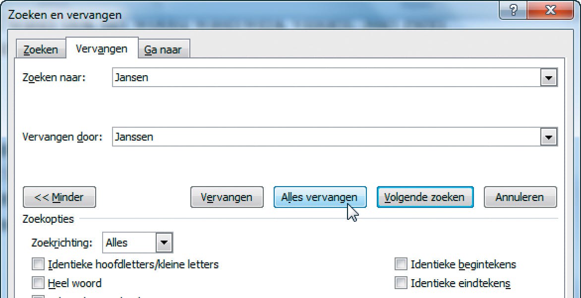 Zoeken alleen kan soms handig zijn, maar nóg handiger is het om in één run herhaaldelijk fout gespelde woorden te vervangen. Stel, u hebt in een lang document continu de naam Janssen als Jansen geschreven. Dan kan het een monnikenwerk zijn om met de hand die naam overal aan te passen. Ook de kans op het missen van een foutief gespeld woord is natuurlijk levensgroot. Door in het lint onder Start op Vervangen te klikken kunt u dit hele gebeuren automatiseren. Vul in het veld achter Zoeken naar het fout gespelde woord in (in ons voorbeeld dus Jansen) en in het veld achter Vervangen door de juist gespelde variant. Klik dan op de knop Alles vervangen en alles wordt in een klap vervangen. Makkelijker kunnen we het niet maken. Ook bij deze manier van zoeken en vervangen geldt dat u wederom gebruik kunt maken van de extra opties als Identieke hoofdletters/kleine letters en Heel woord. In plaats van op de knop Alles vervangen kunt u ook herhaaldelijk op Vervangen klikken, daarmee houdt u de controle over het vervangproces.
