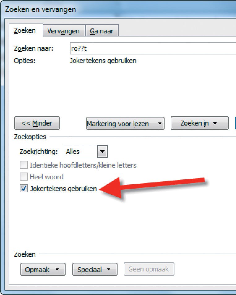 Jokertekens zijn ideaal om woorden te zoeken waarvan u de exacte spelling niet helemaal meer weet. Meest praktische jokerteken is wellicht het vraagteken. Zoeken naar ho? levert bijvoorbeeld de woorden hop, hol en hok op. Zoeken naar ro??t levert bijvoorbeeld het woord robot op, maar niet iets als roet of Robert. Het vraagteken geeft simpelweg aan dat op de plaats van het vraagteken (en alleen daar) iedere voorkomende letter mag staan. Vergelijk het maar een beetje met het blanco letterblokje in Scrabble! LET OP: Om de zoek- en/of vervangfunctie op deze manier te laten werken dient u in het zoek- of vervangvenster de optie Jokertekens gebruiken in te schakelen. En na gebruik natuurlijk niet weer vergeten uit te schakelen...