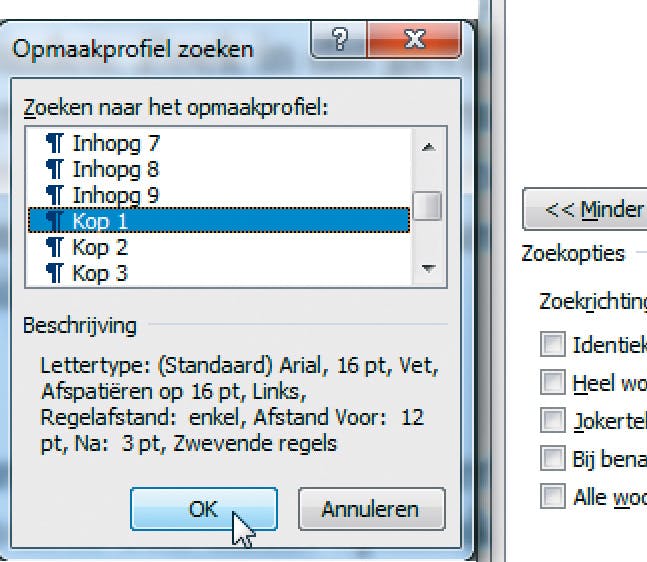 Het is ook mogelijk naar specifieke opmaakkenmerken in tekst te zoeken en deze - indien gewenst - te laten vervangen door een ander opmaakkenmerk. Ook zoeken naar bijvoorbeeld koppen in een tekst is daardoor erg eenvoudig geworden, mits u de koppen ook trouw hetzelfde opmaakprofiel hebt gegeven. Stel dat dit in onze tekst Kop 1 is, dan klikt u in het lint onder Start op Zoeken. Klik vervolgens weer op de knop Meer en klik op de knop Opmaak waarna u voor Opmaakprofiel kiest. In het venster Opmaakprofiel zoeken selecteert u dan in de lijst het gewenste opmaakprofiel, in ons voorbeeld dus Kop 1. Klik op OK en daarna kunt u met de knop Volgende zoeken van kop naar kop springen.