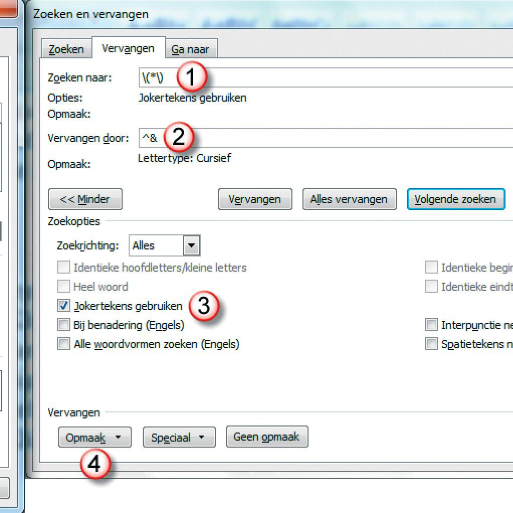 p>Laten we eens wat technieken samenvoegen en naar alle teksten tussen haakjes zoeken om deze vervolgens schuin te laten zetten. Klik op het inmiddels bekend veronderstelde Vervangen in het veld achter Zoeken naar en typ de zoekstring \(*\) (1), zie Stap 6. Klik in het veld achter Vervangen door en typ daar ^& (2). Deze ietwat geheimzinnig ogende code vertelt Word de gevonden tekst inhoudelijk te vervangen door exact dezelfde tekst maar tegelijkertijd de opmaakkenmerken toe te passen die we nu gaan instellen. Schakel de optie Jokertekens gebruiken (3) in, klik op de knop Opmaak (4) en selecteer in het geopende menu de optie Lettertype. In het venster Lettertype vervangen selecteert u onder Tekenstijl Cursief (5). Klik op OK en u kunt met een klik op de knop Alles vervangen in een keer alle tussen haakjes staande tekst schuin zetten, waarbij de haakjes zelf ook netjes behouden blijven.